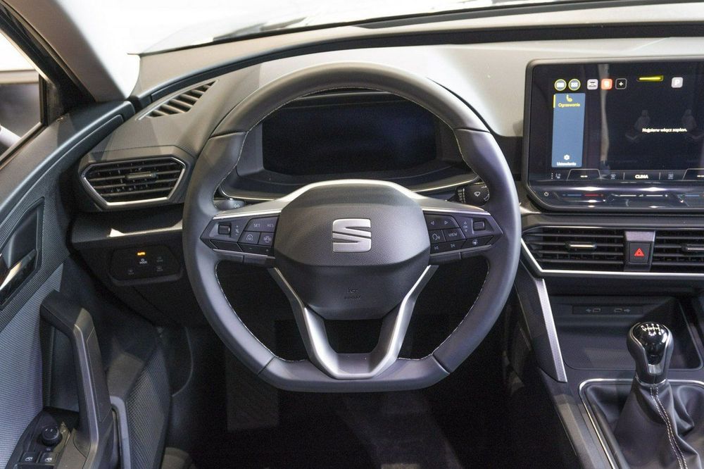 • Sportowa kierownica wielofunkcyjna obszyta skórą z białym przeszyciem